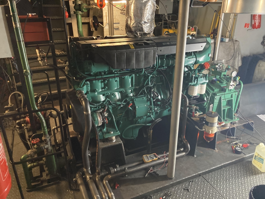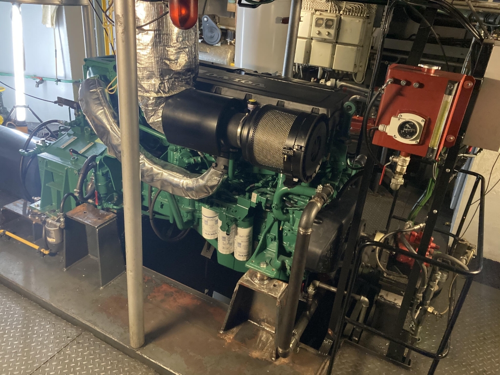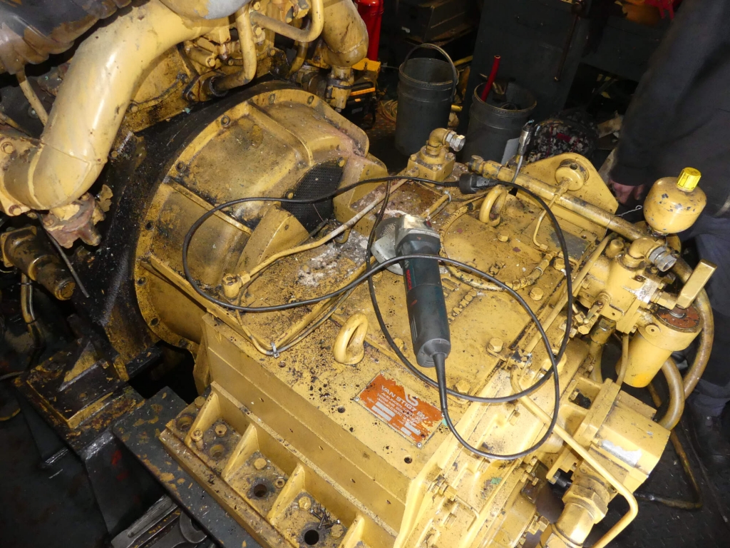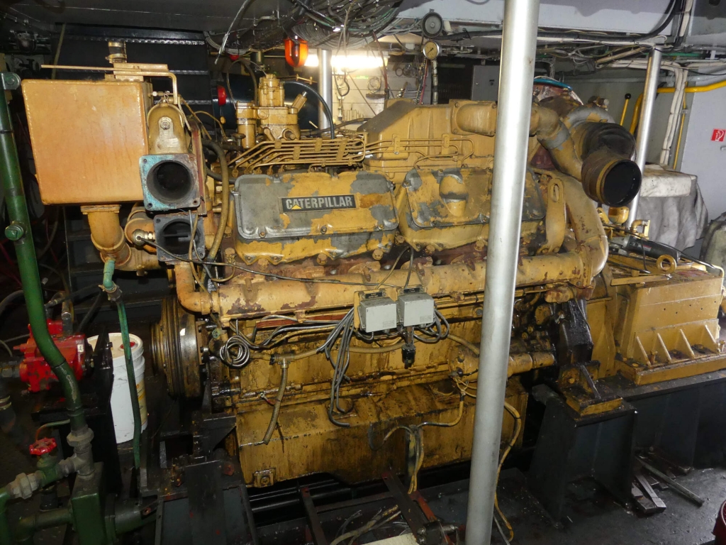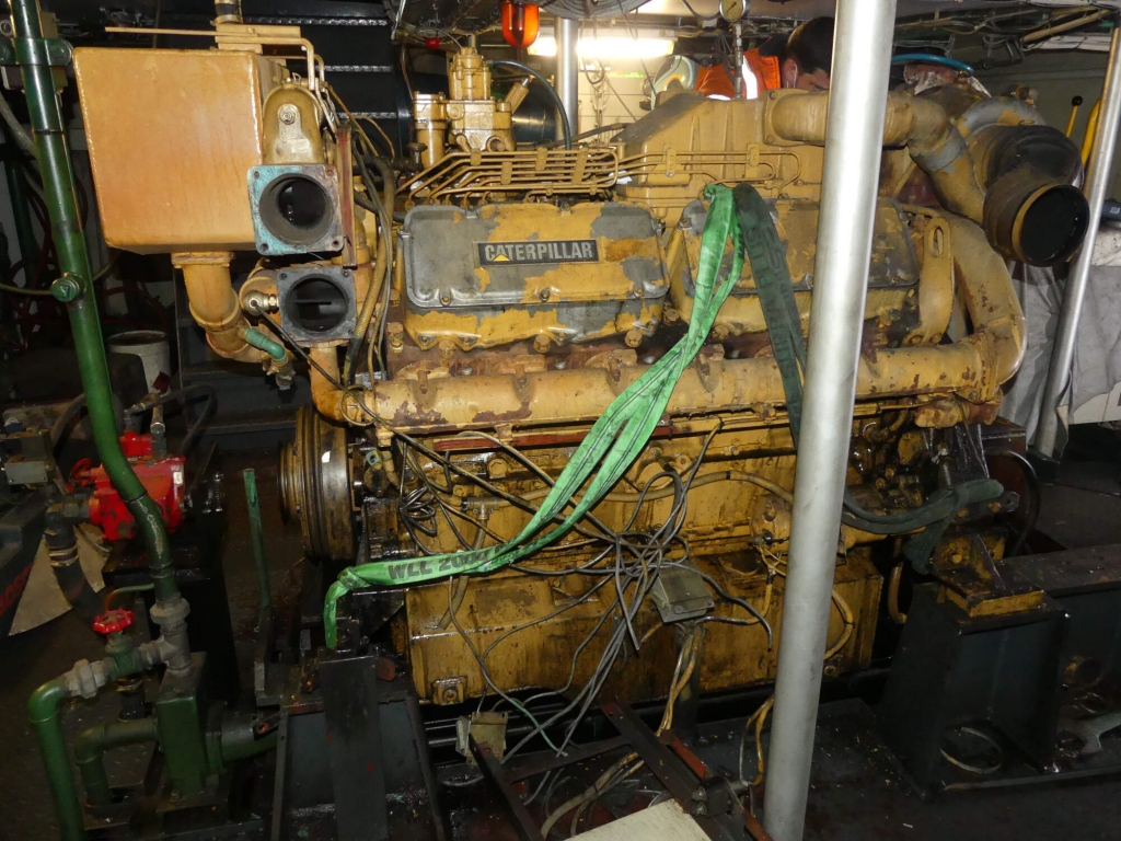 Le moteur Caterpillar a été sorti de la salle des machines en chandelle pour passer par la chapelle du bateau.