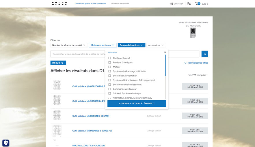 Une fois votre modèle moteur ou transmissions exact séléctionné, vous pouvez affiner les résultats avec le filtre « groupe de fonctions » ou avec la recherche par texte.