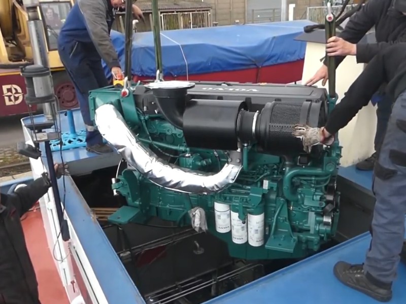 L'ancien moteur Cummins a rendu service pendant de nombreuses années. Il est temps de passer au vert avec un nouveau moteur Volvo Penta D16 MH en CCNR2 et un inverseur REINTJES. Une belle installation neuve pour cette péniche !
