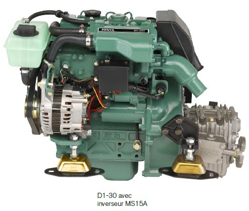 Le Volvo Penta D1-30 est un moteur marin diesel à 3 cylindres en ligne de 1,1 litre à aspiration naturelle, utilisant une pompe d'injection en ligne entraînée par came et un refroidissement par eau douce. Moteur inboard (in bord), il est disponible en configuration arbre ou saildrive. L'ensemble offre un faible régime de croisière avec un fonctionnement silencieux et un minimum de vibrations.