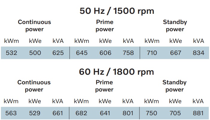 Le moteur diesel de 17 litres utilise des turbocompresseurs à deux étages et des pistons en acier robustes, ce qui le rend conçu de manière optimale pour alimenter une large gamme de groupes électrogènes de secours (jusqu'à 881 kVA) et de puissance principale (jusqu'à 758 kVA).
