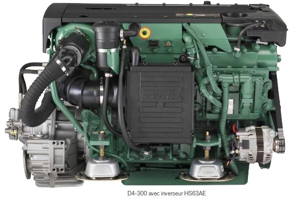 Le moteur 4 cylindres D4-300 de Volvo Penta a été développé en bénéficiant des tous derniers concepts de la technologie diesel moderne. Moteur inboard (in bord), il est doté d’un système d’injection directe à rampe commune avec deux arbres à cames en tête, 4 soupapes par cylindre, turbo compresseur et échangeur de température. Grâce au grand volume d’air balayé et au système EVC (Electronic Vessel Control), il atteint de très hautes performances avec de faibles rejets polluants. Le moteur est extrêmement compact compte tenu de la puissance fournie.