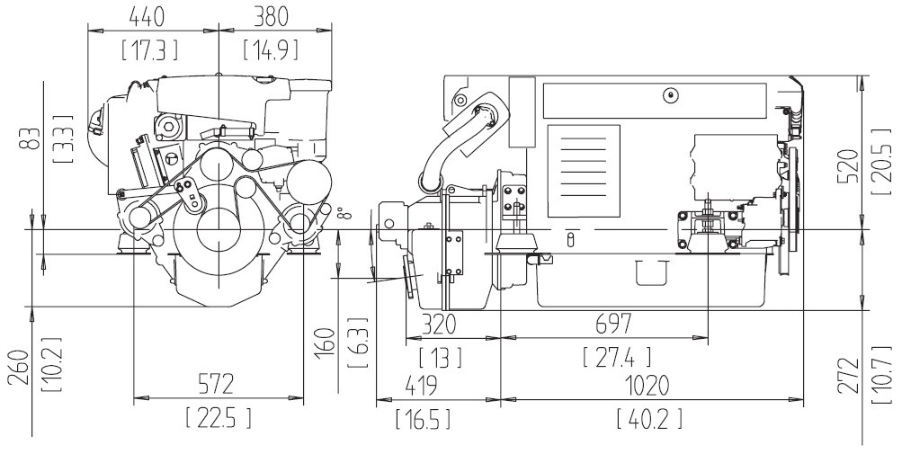 - Inverseur avec axe abaissé et angle d’inclinaison de 8° pour une installation compacte et un angle d’arbre d’hélice minimum. Transmission en V disponible.
