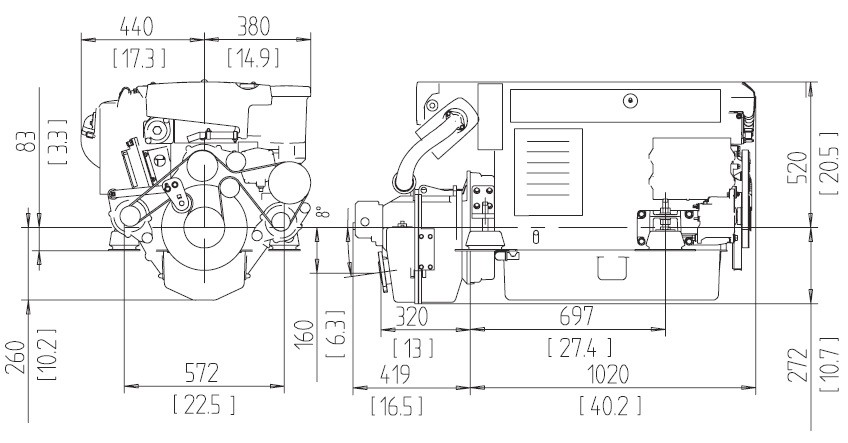 - Inverseur avec axe abaissé et angle d’inclinaison de 8° pour une installation compacte et un angle d’arbre d’hélice minimum. Transmission en V disponible.
