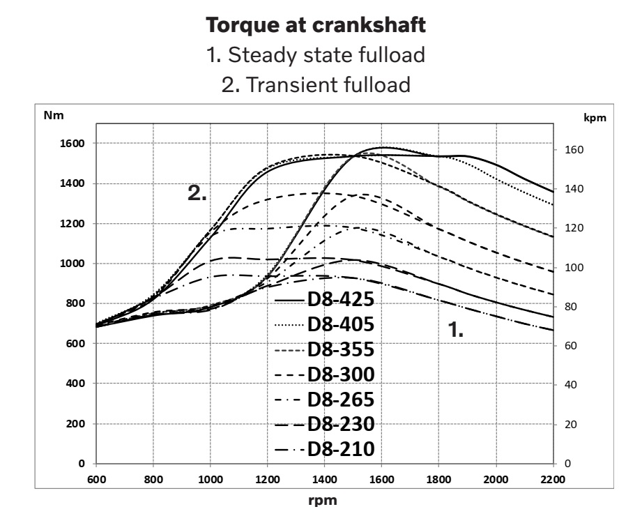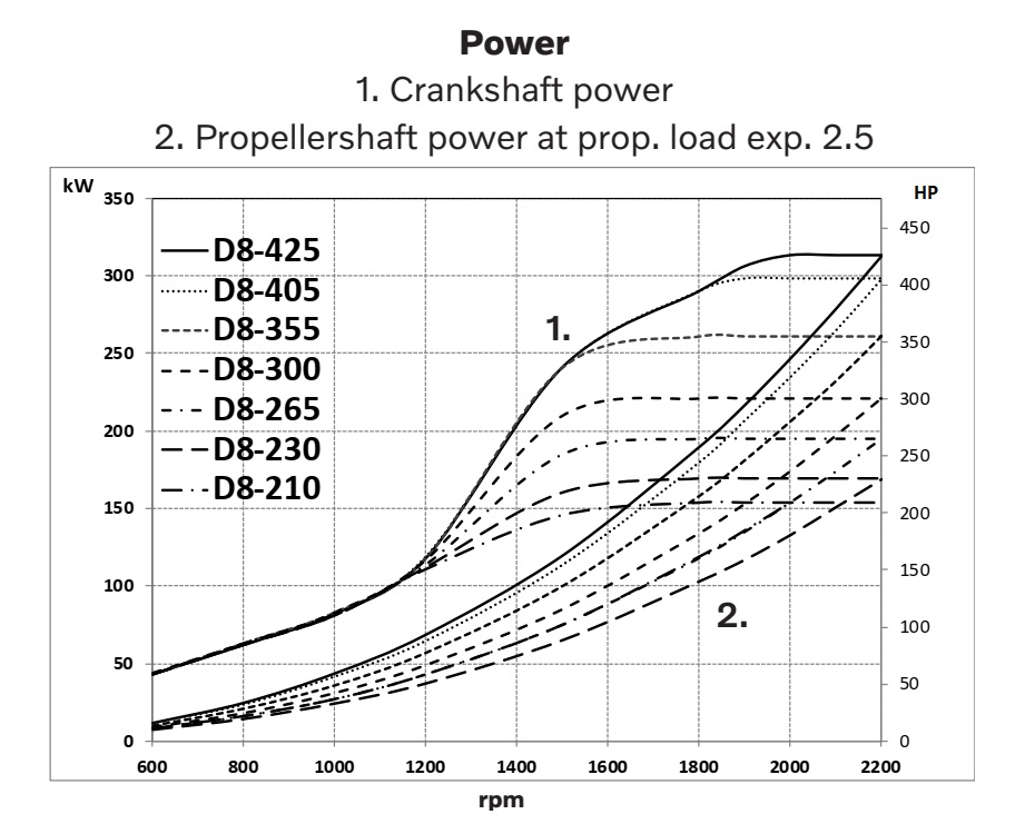 Puissances disponibles (puissance au vilebrequin selon norme ISO 8665) : 154 kW (210 ch), 169 kW (230 ch), 195 kW (265 ch), 221 kW (300 ch), 261 kW (355 ch), 296 kW (405 ch), 313 kW (425 ch).