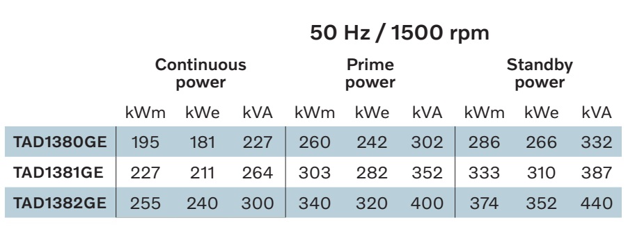 Puissances électriques disponibles : 302–401 kVA (production primaire 50Hz) / 318-412 kVA (production primaire 60Hz).