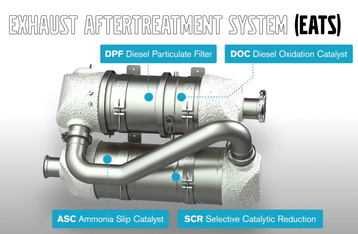 Pour atteindre cet objectif, le système post-traitement des gaz d’échappements Stage V de Volvo Penta embarque un DOC (Catalyseur d’oxydation Diesel) qui transforme les Hydrocarbures, le Monoxyde de carbone et le Monoxyde d’azote, un DPF (Filtre à Particules Diesel) qui retient la suie produite par la combustion, un DEF (Diesel Exhaust Fluid/Adblue) qui injecte une solution riche en urée AdBlue, un filtre SCR (Réduction Catalytique sélective) qui réduit le monoxyde et le dioxyde d’azote, et enfin un ASC (Amonia Slip Catalyst) qui permet de diminuer l’ammoniaque présent suite à l’injection d’AdBlue.